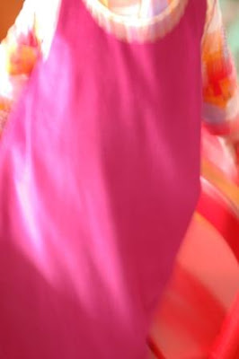 Isabelle has kindly agreed to model for us her mother's latest creation: the much-too-long, much-too-wide, very-pretty-colours-though dress.